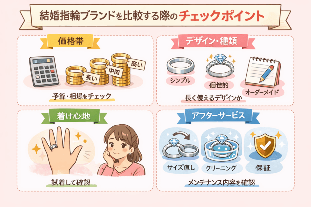 結婚指輪を選ぶときは、ブランド名や見た目だけでなく、複数のポイントを比較することが大切です。